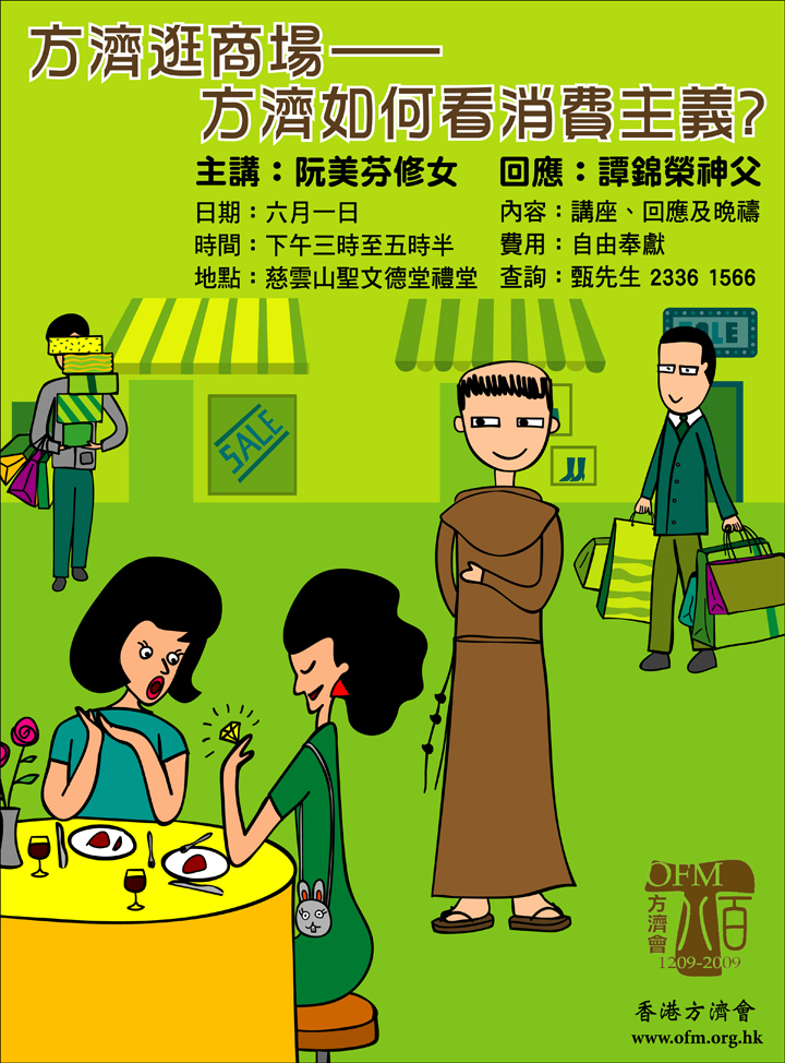 (三)方濟購物指南: 辨別需要與慾望: 1.模範---貧窮的基督 兄弟不保有任何地方、物品。 2.窮人的生活:方濟會三大特色---赤足、衣服質料粗糙、避免保有金錢,甚至不保留急需品。(Albert兄弟) 3.以旅行者的心態生活,因為基督為我們成為貧窮的。(會規二6) 因此,方濟弟子衣著簡樸、不追求時款、不多買、不貪便宜。 物質是天父的恩賜: 1.為所有的人享用---人人平等、各取所需。不浪費、不過剩,才能使有需要的人得到所需。 2.方濟的首要目標是任何人都不缺所需: 方濟分衣服給有需要的人:他的論點---衣服是借給他用的,遇到比他更窮的人便要歸還。 3.太空船原理:大自然產物足夠世世代代人享用,任何人多用會造成其他人缺乏所需。 不購買破壞生態環境的產品: 萬物是在基督內受造,同出一源、同一造物主、同一天父、同為兄弟姊妹,應受尊重愛護。 (Fioretti)方濟營救鴿子,加以飼養,命它依照天父的計劃去繁殖。方濟營救羊、在冬天餵養蜜蜂.… 萬物是天父的反映,使人歸向天父。 (四)管家態度(不佔有心態): 1.Sine Proprio:小兄弟應沒有屬於自己的東西。(會規二1.2) 真福精神生活:所有東西都來自天主,要與人分享。 正義:富有人家的剩餘屬於窮人。 (五)天主子女的自由: 1.全心依靠天父的照顧 2.有安全和滿足 3.自由自在:兩袖清風、不為世物所束縛。 4.回復創世時的境界,在天父面前袒露(方濟脫光衣服的啟示)。 (六)結語: 物質是天主的恩賜,我們要加以愛護尊重,去發現它們的尊嚴與美好,與它們對話,並透過它們默觀天主,歸向天主。 我們並非由先人承繼大地,而是向下一代借用,方濟式生活要求我們將它歸還天主,讓祂保存,使下一代得以繼續享用。 |